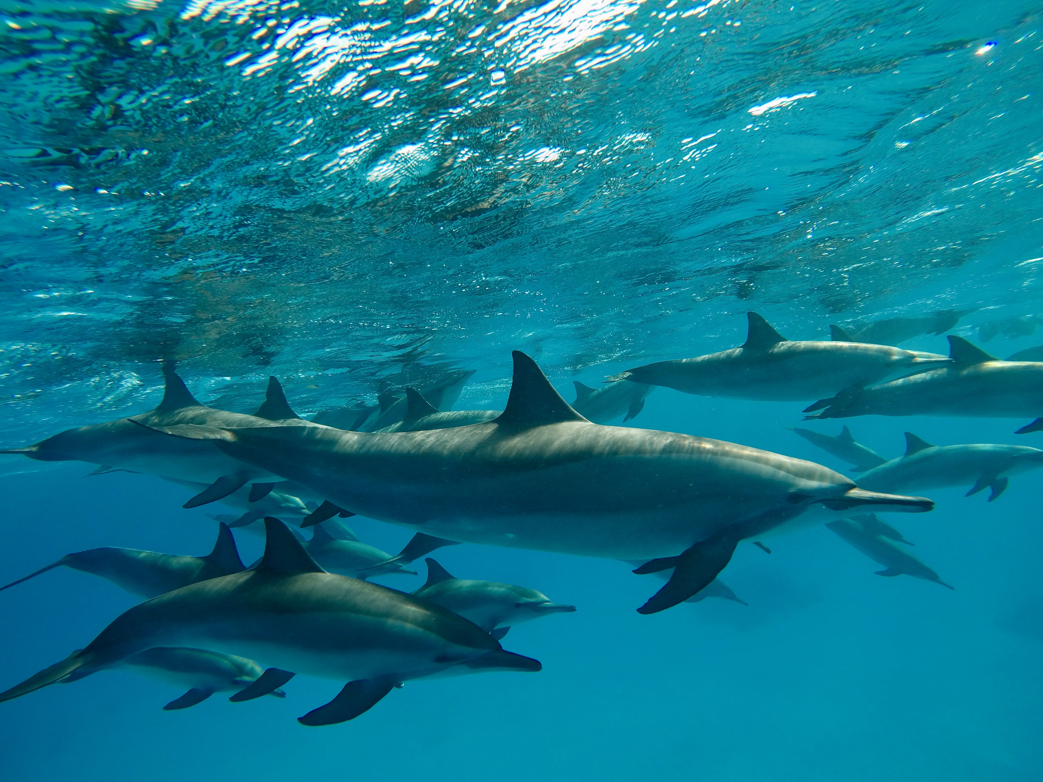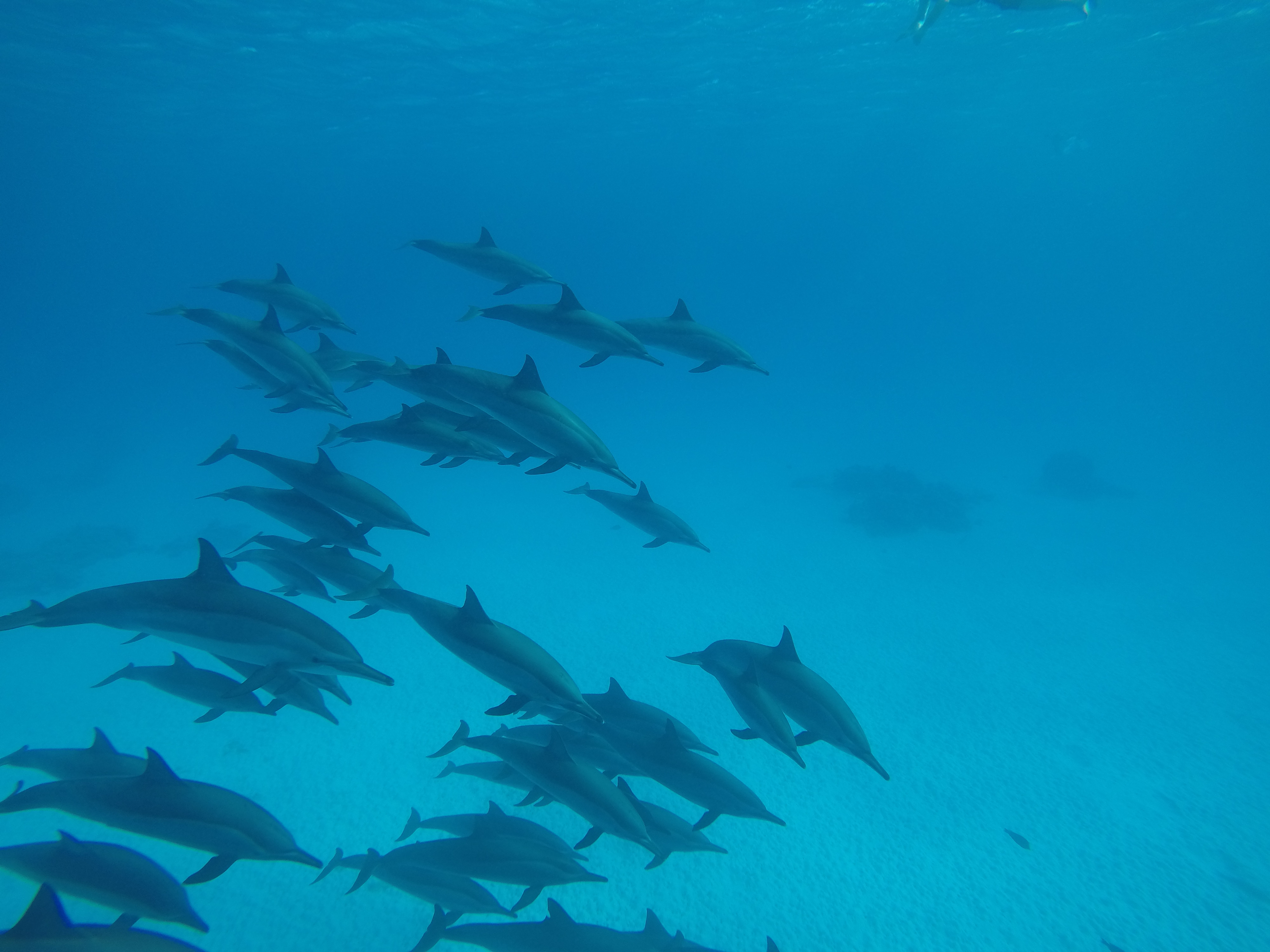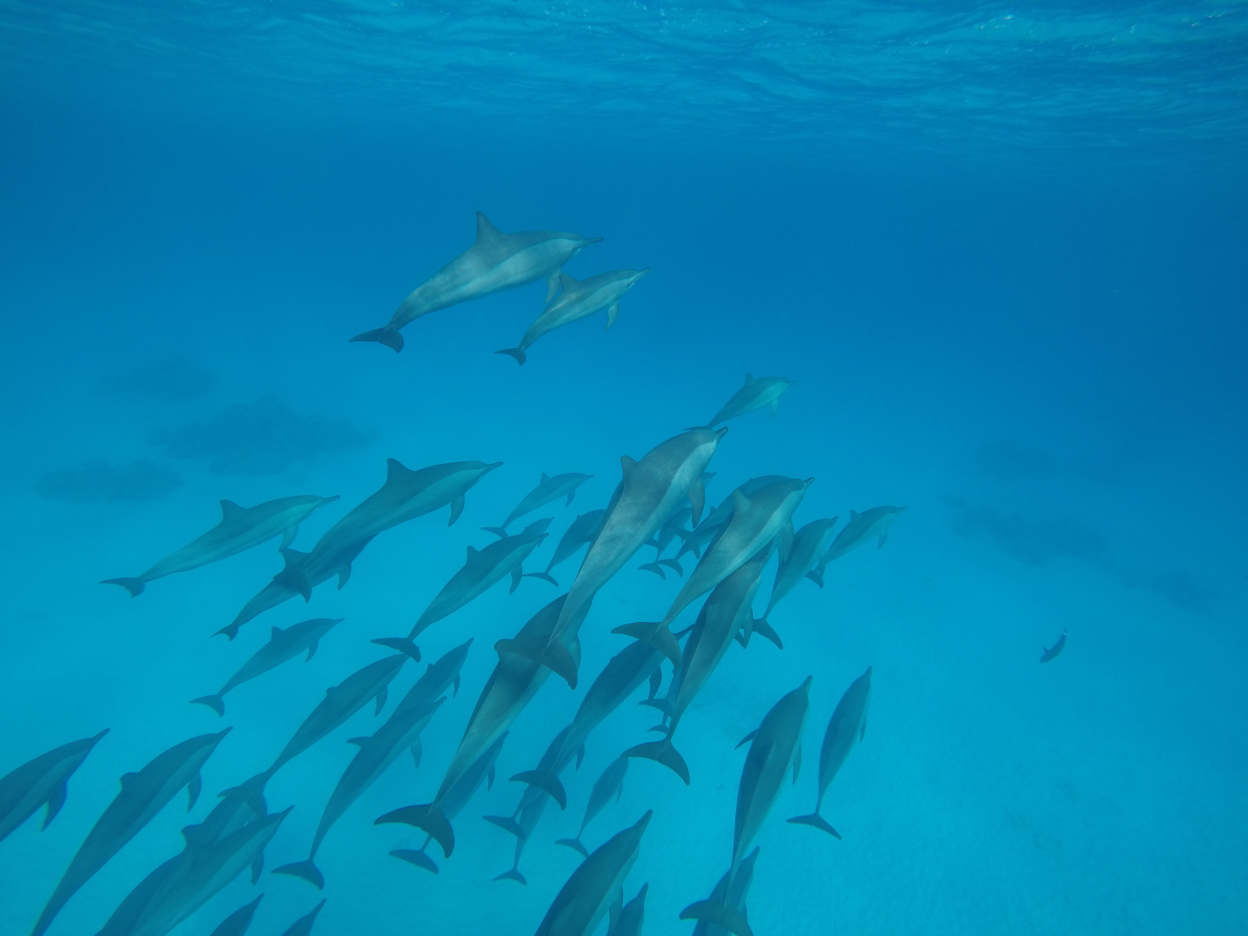 Nous sommes les seuls et nous partons à la recherche des dauphins. Nous avons eu beaucoup de chance car nous avons vu une trentaine de dauphins. Le matin ils dorment, ils ont les yeux fermés. L’après-midi ils sont très actifs et joueurs. Ensuite ils partent au large chasser.