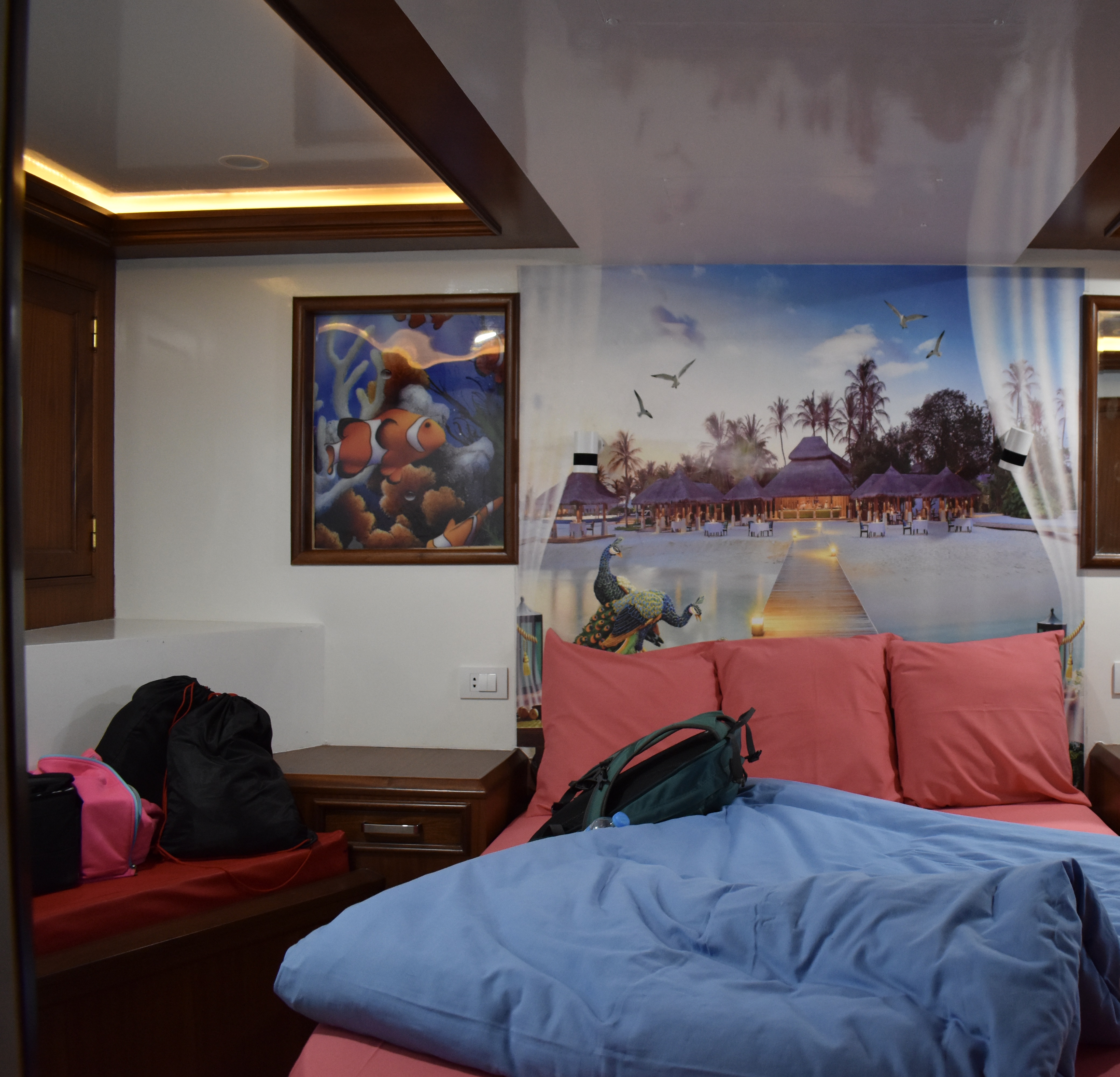 Nous profitons de l’aquarium que nous avons juste devant l’hôtel. Il y a une grande variété de poissons, et des coraux magnifiques.