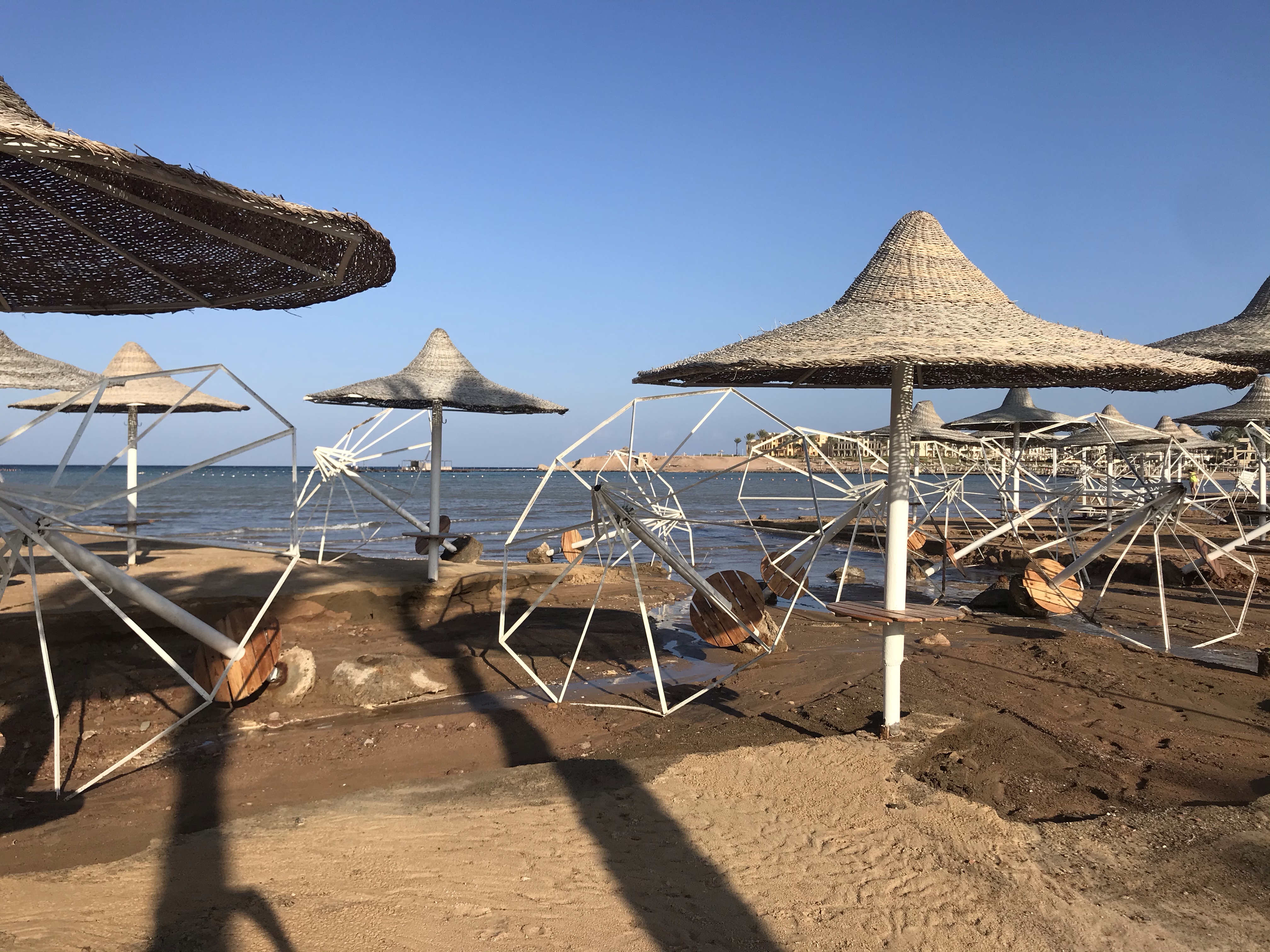 Il pleut encore et les dégâts de la veille sont impressionnants. La plage à coté de l’hôtel a été bien abimée, les parasols sont tombés et il y a eu des inondations.